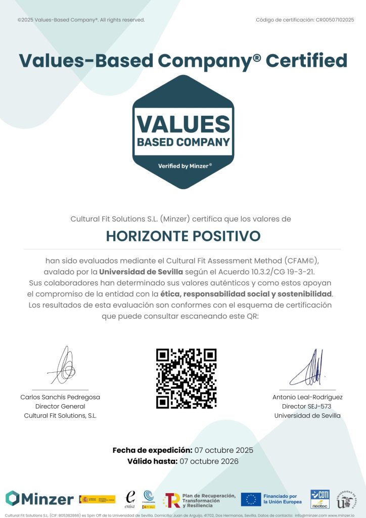 El equipo ejecutivo de Horizonte Positivo participó en un análisis de cultura organizacional, obteniendo una calificación superior a 90 puntos en dimensiones como enfoque digital, confianza, innovación y orientación a resultados.